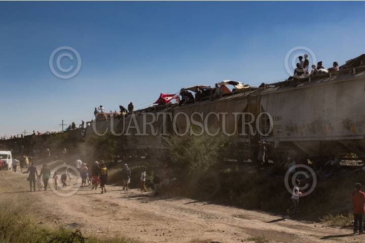 GENERAL ENRIQUE ESTRADA, ZACATECAS, 29SEPTIEMBRE2023.- Alrededor de mil quinientas personas entre niños, mujeres y hombres, todos migrantes de diferentes países como Venezuela, Colombia, Nicaragua, El Salvador, Angola, entre otros; fueron abandonados a su suerte por la empresa Ferromex, al dejar los vagones sobre las vias en medio de campos de cultivo, muy cerca de la comunidad de Miguel Hidalgo, un lugar despoblado en donde los viajantes no tienen posibilidad de conseguir alimentos o agua. Los migrantes informaron que desde la madrugada se detuvo la llamada "Bestia" y elementos del Instituto Nacional de Migración, en compañia de Guardia Nacional, los intimidaron para que bajaran de los vagones, ante su negativa 20 de ellos fueron detenidos. Tras subir de tono el altercado los agentes del INM le pidieron al maquinista del tren desenganchar la máquina para dejarlos a su suerte. Durante el día ciudadanos solidarios estuvieron proporcionandoles alimentos y agua en lo que hallaban otra alternativa de continuar con su viaje hacia los Estados Unidos. FOTO: ADOLFO VLADIMIR/CUARTOSCURO.COM