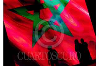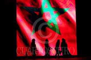 MARRAKECH, MARRUECOS, 29SEPTIEMBRE2023.- Las siluetas de visitantes y habitantes locales de la ciudad de Marrakech se dibuja en una bandera del país que es proyectada en los paneles del Palacio de Congresos de la entidad. FOTO: GALO CAÑAS/CUARTOSCURO.COM