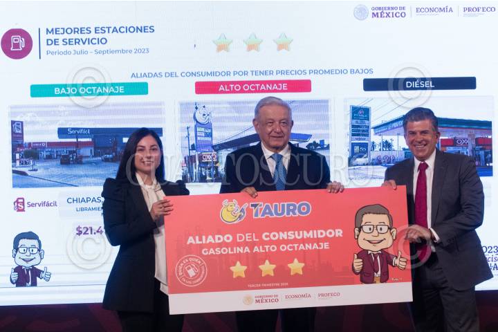 CIUDAD DE MÉXICO, 02OCTUBRE2023.- Valeria Karina Campos Reyes de gasolinera Taura recibió un reconocimiento por parte de Profeco por dar el precio más bajo en la venta de gasolina de alto octanaje. El galardón lo entrego Andrés Manuel López Obrador y Ricardo Sheffield Padilla, durante la mañanera. FOTO: MOISÉS PABLO/CUARTOSCURO.COM