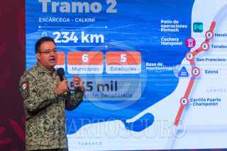 CIUDAD DE MÉXICO, 02OCTUBRE2023.- Óscar David Lozano Águila, director general de Tren Maya, SA de CV, habló sobre el Tramo 2 del llamado Jaguar Rodante durante la mañanera. FOTO: MOISÉS PABLO/CUARTOSCURO.COM