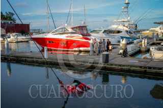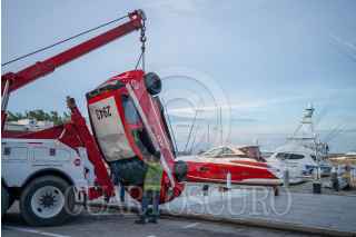 VERACRUZ, VERACRUZ, 02OCTUBRE2023.- Un equipo de trabajadores y buzos especializados retiraron con una grúa la unidad de taxi con número económico 2943, que se hundió esta madrugada en el interior del club de yates del puerto de Veracruz, el conductor huyó posteriormente a su accidente dejando su vehículo abandonado mientras se hundía bajo el agua, donde permaneció por más de 12 horas. FOTO: VICTORIA RAZO/CUARTOSCURO.COM
