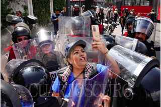 CIUDAD DE MÉXICO, 03OCTUBRE2023.- Transportistas de la Ciudad de México; protestaron esta mañana con un bloqueo en Calzada de la Bombas & Armada de México de la alcaldía Coyoacán. Policías capitalinos encapsularon a los manifestantes, quienes exigen audiencia con autoridades de la Secretaria de movilidad. FOTO: ROGELIO MORALES/CUARTOSCURO.COM