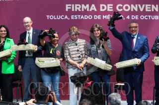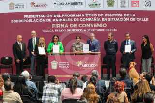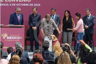 TOLUCA, ESTADO DE MÉXICO, 04OCTUBRE2023.- Delfina Gómez Álvarez Gobernadora del Estado de México encabezó la Presentación del Programa Ético de Control de la Sobrepoblación de Animales de Compañía en Situación de Calle y Firma de Convenio con CEPANAF, Secretaria de Medio Ambiente y Desarrollo Sostenible, UAEM, UNAM, Federación Canofila Mexicana AC y CEMVZEM; en el marco del Día Mundial de los Animales indicó que se busca concientizar a la población para que los animales tengan un mejor futuro, así como fomentar la cultura de respeto en la entidad mexiquense para evitar el maltrato animal. FOTO: CRISANTA ESPINOSA AGUILAR /CUARTOSCURO.COM