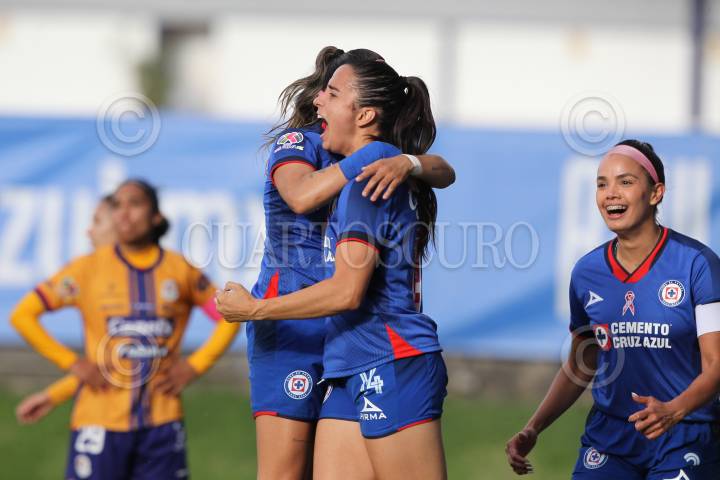 CIUDAD DE MÉXICO, 06OCTUBRE2023. Catalina Estrada festejó su segunda anotación en el triunfo de la Máquina Cementera con marcador de 3-1, durante el partido de fútbol Cruz Azul vs Atlético San Luis correspondiente a la jornada 13 del Torneo Apertura 2023 de Liga BBVA MX Femenil, en instalaciones de La Noria. FOTO: EDGAR NEGRETE LIRA/CUARTOSCURO.COM