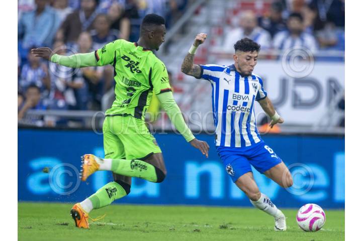 GUADALUPE, NUEVO LEÓN, 07OCTUBRE2023.- Joao Rojas del Monterrey se disputa el balón con Moisés Castillo de FC Juárez, en el estadio BBVA, partido correspondiente a la jornada 12 de la Apertura 2023. Marcador Final: Monterrey 3 - FC Juárez 1. FOTO: GABRIELA PÉREZ MONTIEL / CUARTOSCURO.COM