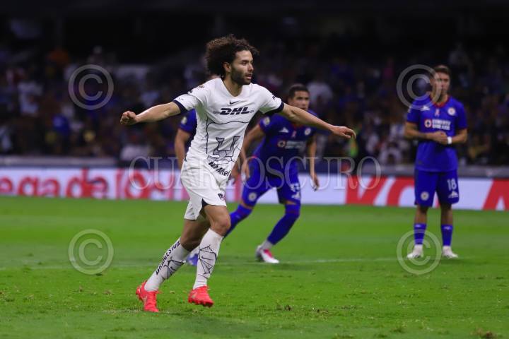 CIUDAD DE MÉXICO, 07OCTUBRE2023. César Huerta de los Universitarios festeja un gol de penal durante el partido de fútbol Cruz Azul vs Pumas correspondiente a la jornada 12 del Torneo Apertura 2023 de Liga BBVA MX en el Estadio Azteca. FOTO: EDGAR NEGRETE/CUARTOSCURO.COM