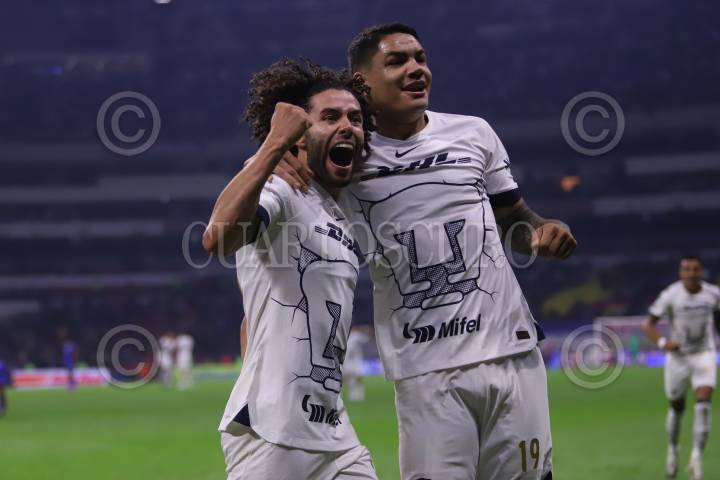 CIUDAD DE MÉXICO, 07OCTUBRE2023. César Huerta y Gabriel Fernández festejan un gol durante el partido de fútbol Cruz Azul vs Pumas correspondiente a la jornada 12 del Torneo Apertura 2023 de Liga BBVA MX en el Estadio Azteca. FOTO: EDGAR NEGRETE/CUARTOSCURO.COM