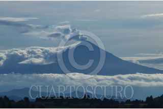 OCUILAN, ESTADO DE MÉXICO, 08OCTUBRE2023.- El reporte del Centro Nacional de Prevención de Desastres sobre la actividad del volcán Popocatépetl, informa que en las ultimas 24 horas este ha emitido 94 exhalaciones de baja intensidad, acompañadas de vapor de agua, gases volcánicos y ligeras cantidades de ceniza. Imagen tomada esta mañana desde la Sierra de Ocuilan. FOTO: MARGARITO PÉREZ RETANA / CUARTOSCURO.COM