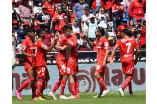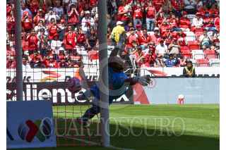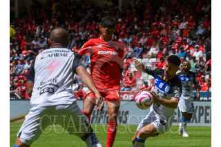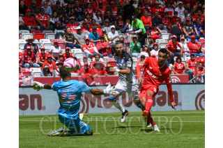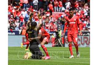 TOLUCA, ESTADO DE MÉXICO, 08OCTUBRE2023.-Robert Morales delantero de los Diablos de Toluca y Federico Lertora medio de Gallos Blancos de Querétaro en la cancha del Nemesio Diez, como parte de la jornada 12 del Torneo Apertura 2023 de la Liga MX, lográndose imponer la escuadra escarlata con un marcador final 3-1. FOTO: CRISANTA ESPINOSA AGUILAR /CUARTOSCURO.COM
