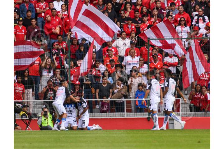 TOLUCA, ESTADO DE MÉXICO, 08OCTUBRE2023.- Jugadores de Gallos Blancos de Querétaro festejan su anotación ante los Diablos de Toluca quienes se enfrentaron en la cancha del Nemesio Diez, como parte de la jornada 12 del Torneo Apertura 2023 de la Liga MX, lográndose imponer la escuadra escarlata con un marcador final 3-1. FOTO: CRISANTA ESPINOSA AGUILAR /CUARTOSCURO.COM