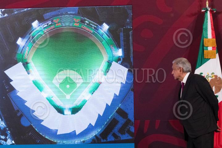 CIUDAD DE MÉXICO, 09OCTUBRE2023.- Andrés Manuel López Obrador, Presidente de México, observa una tender de los avances de la construcción del Estadio Kukulcán en Yucatán, durante la mañanera. FOTO: MOISÉS PABLO/CUARTOSCURO.COM