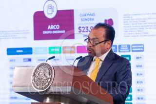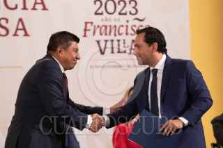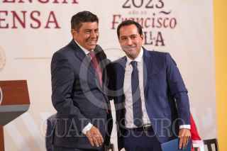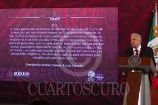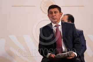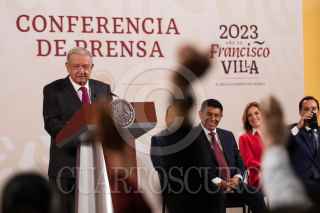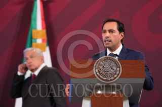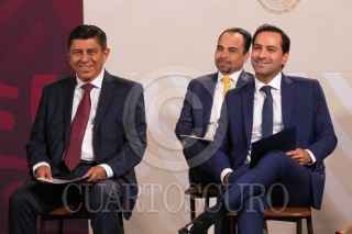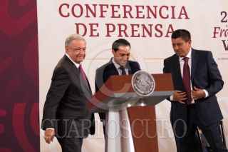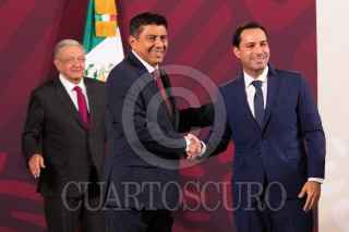 CIUDAD DE MÉXICO, 09OCTUBRE2023.- Andrés Manuel López Obrador, Presidente de México, atestiguó el cambio de presidencia de la Conago. Salomón Jara, gobernador de Oaxaca, entregó el liderazgo a Mauricio Vila, gobernador de Yucatán, durante la mañanera. FOTO: MOISÉS PABLO/CUARTOSCURO.COM