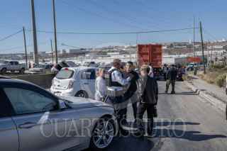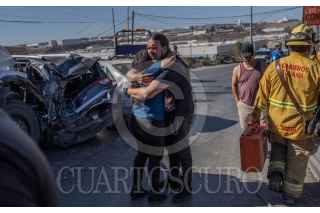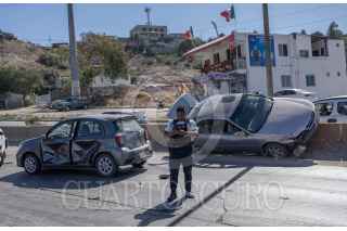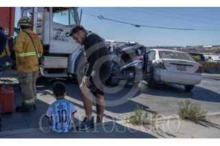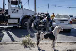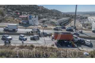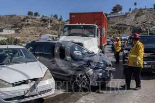 TIJUANA, BAJA CALIFORNIA, 10OCTUBRE2023.-Bomberos observan los vehículos impactados por el tractocamión al quedarse sin frenos . Siete vehículos se vieron afectados tras el incidente causando el cierre parcial de la vialidad tras el aparatoso evento donde un carro quedó sobre el muro que divide los dos sentidos del bulevar y dos mas que fueron impactados por el tractocamión de una empresa de reciclaje. Paramédicos de la Cruz Roja y Elementos del Cuerpo de Bomberos acudieron al lugar para brindar atención medica a las víctimas, entre ellas un menor, quienes no presentaron lesiones de gravedad. FOTO: OMAR MARTÍNEZ / CUARTOSCURO.COM