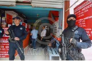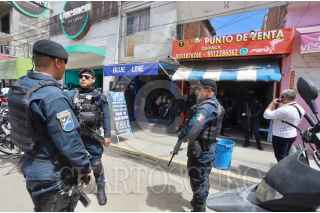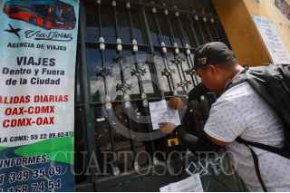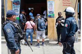 OAXACA, OAXACA, 12OCTUBRE2023.- Este mediodía policías estatales y municipales, así como inspectores del ayuntamiento de Oaxaca de Juárez, realizaron un operativo para revisar y clausurar taquillas de supuestas agencias de viajes que operan en inmediaciones de la Central de Abasto. Al menos 8 establecimientos fueron clausurados por falta de documentación e irregularidades en la venta de boletos a migrantes. FOTO: CAROLINA JIMÉNEZ/CUARTOSCURO.COM