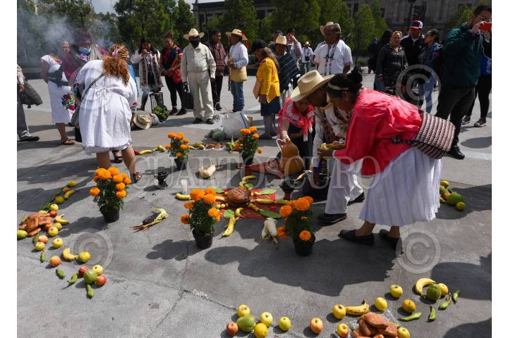 TOLUCA, ESTADO DE MÉXICO, 12OCTUBRE2023.- Integrantes de los pueblos originarios del Estado de México, otomis, mazahuas, tlahuicas, mexicas y matlazincas realizaron una ceremonia ancestral en la Plaza de los Mártires en el marco del Día de la Resistencia Indígena, en un acto de resistencia y defensa de sus costumbres y tradiciones, preservación de su lengua y cultura, exigen reconocimiento y apoyo. FOTO: CRISANTA ESPINOSA AGUILAR /CUARTOSCURO.COM