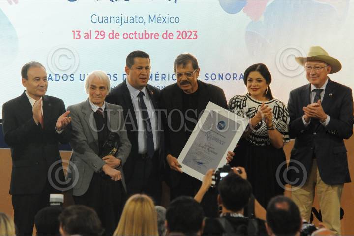 GUANAJUATO, GUANAJUATO, 13OCTUBRE2023. - Los gobernadores de Sonora, Alfonso Durazo, de Guanajuato, Diego Sinuhe, la Secretaría de Cultura, Alejandra Frausto y el embajador de Estados Unidos en México Ken Salazar, entregaron las preseas Cervsntinas y dieron por inaugurado el Festival Cervantino en su edición 51. FOTO: DANIEL AUGUSTO /CUARTOSCURO.COM