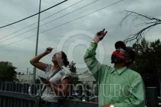 CIUDAD DE MÉXICO, 14OCTUBRE2023.- Personas a lo largo de la ciudad se dieron breves minutos para apreciar el eclipse anular de sol que fue visible en la mayoría del territorio nacional. En punto de las 11:09 horas el fenómeno astronómico se encontró en su punto, con una cobertura de 60?l sol sobre la capital. FOTO: GALO CAÑAS/CUARTOSCURO.COM