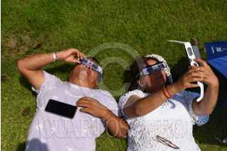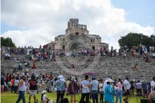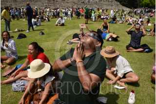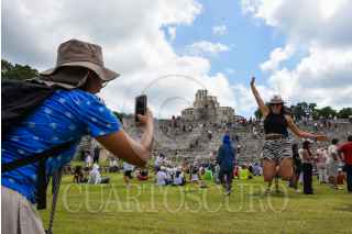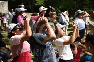 CAMPECHE, CAMPECHE 14OCTUBRE2023.- Cientos de turistas nacionales e internacionales se dieron cita en la zona arqueológica de Edzná para presenciar el eclipse anular de sol, el cual apreciado en su totalidad sobre el cielo de la entidad. FOTO: MICHAEL BALAM/CUARTOSCURO.COM