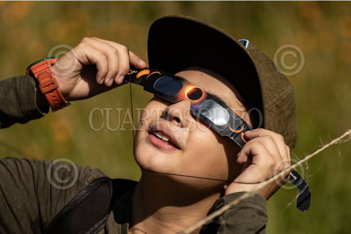 VILLANUEVA, ZACATECAS, 14OCTUBRE2023.- Cientos de zacatecanos se dieron cita en la zona arqueológica de La Quemada, a 70 kilómetros de la capital zacatecana; para visitar el sitio y poder observar el eclipse solar anular, que en la mayoría del territorio zacatecano se pudo observar en un 70?bloqueo del sol por parte de la luna. Personal del Instituto Nacional de Antropología e Historia delegación Zacatecas ofreció lentes para que las personas pudieran observar con cuidado el fenómeno astronómico. FOTO: ADOLFO VLADIMIR /CUARTOSCURO.COM