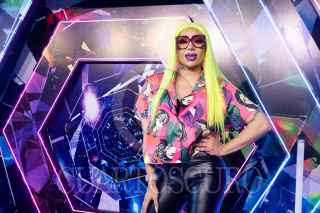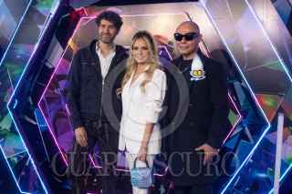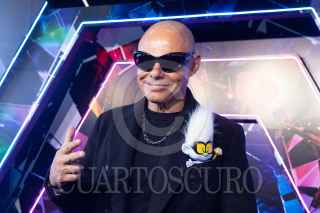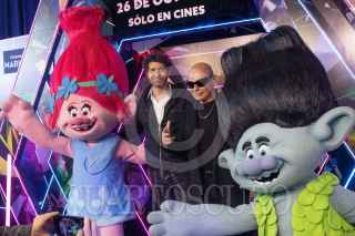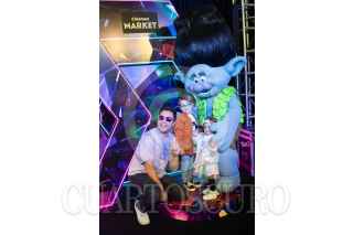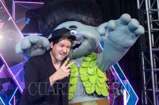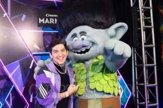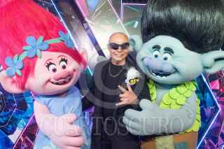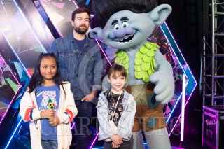 CIUDAD DE MÉXICO, 15OCTUBRE2023.- El actor de doblaje Gabriel "Gabo" Ramos y sus hijos posa con una de las botargas promocionales durante la alfombra azul de la cinta animada "Trolls 3: se armó la banda", cinta que se estrenará el 26 de Octubre a nivel nacional. FOTO: MOISÉS PABLO/CUARTOSCURO.COM