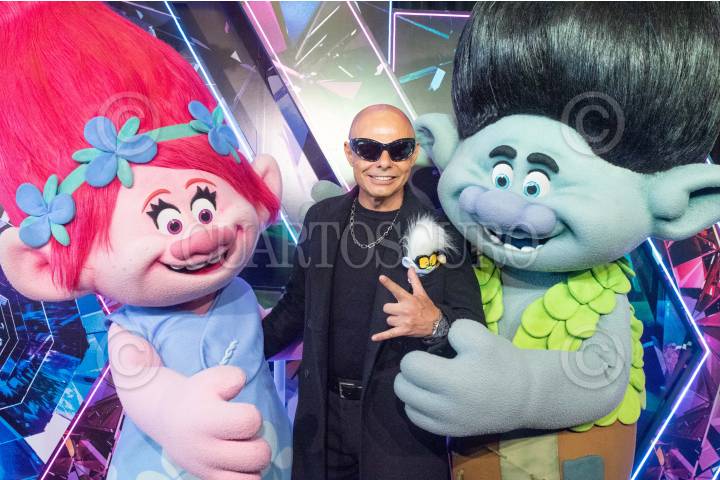 CIUDAD DE MÉXICO, 15OCTUBRE2023.- El cantante Claudio Yarto posa con las botargas promocionales durante la alfombra azul de la cinta animada "Trolls 3: se armó la banda", cinta que se estrenará el 26 de Octubre a nivel nacional. FOTO: MOISÉS PABLO/CUARTOSCURO.COM