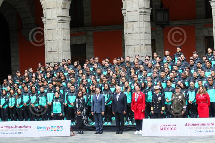 CIUDAD DE MÉXICO, 16OCTUBRE2023.- Leticia Ramírez, titular de la SEP; Martí Batres, Jefe de Gobierno; Andrés Manuel López Obrador, Presidente de México, y Ana Gabriela Guevara directora de la CONADE, durante la ceremonia de abanderamiento del equipo que participará en los Juegos Panamericanos de Santiago de Chile, en Palacio Nacional. FOTO: MOISÉS PABLO/CUARTOSCURO.COM