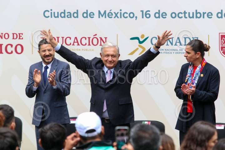 CIUDAD DE MÉXICO, 16OCTUBRE2023.- Leticia Ramírez, titular de la SEP; Martí Batres, Jefe de Gobierno; Andrés Manuel López Obrador, Presidente de México, y Ana Gabriela Guevara directora de la CONADE, durante la ceremonia de abanderamiento del equipo que participará en los Juegos Panamericanos de Santiago de Chile, en Palacio Nacional. FOTO: MOISÉS PABLO/CUARTOSCURO.COM