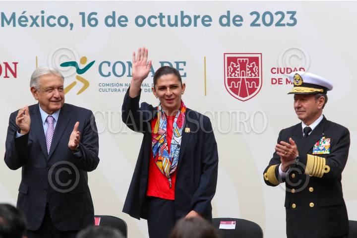 CIUDAD DE MÉXICO, 16OCTUBRE2023.- Andrés Manuel López Obrador, Presidente de México; Ana Gabriela Guevara, directora de la CONADE, y José Rafael Ojeda Durán, titular de la SEMAR, durante la ceremonia de abanderamiento de la delegación que participará en los Juegos Panamericanos de Santiago de Chile. FOTO: MOISÉS PABLO/CUARTOSCURO.COM