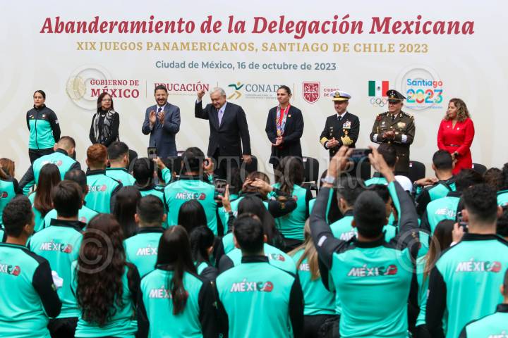 CIUDAD DE MÉXICO, 16OCTUBRE2023.- Leticia Ramírez, titular de la SEP; Martí Batres, Jefe de Gobierno; Andrés Manuel López Obrador, Presidente de México, y Ana Gabriela Guevara directora de la CONADE, durante la ceremonia de abanderamiento del equipo que participará en los Juegos Panamericanos de Santiago de Chile, en Palacio Nacional. FOTO: MOISÉS PABLO/CUARTOSCURO.COM