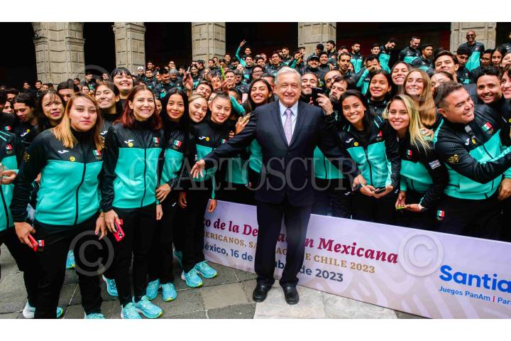 CIUDAD DE MÉXICO. 16OCTUBRE2023.- El presidente de los Estados Unidos Mexicanos, Andrés Manuel López Obrador preside Abanderamiento de la Delegación Mexicana, XIX Juegos Panamericanos Santiago 2023, en Palacio Nacional. Lo acompañan: Leticia Ramírez Amaya, secretaria de Educación Pública; Martí Batres Guadarrama, jefe de Gobierno de la Ciudad de México; Ana Gabriela Guevara Espinoza, Directora General de la Comisión Nacional de Cultura Física y Deporte CONADE; y María José Alcalá, presidenta del Comité Olímpico Mexicano. FOTO: PRESIDENCIA/CUARTOSCURO.COM