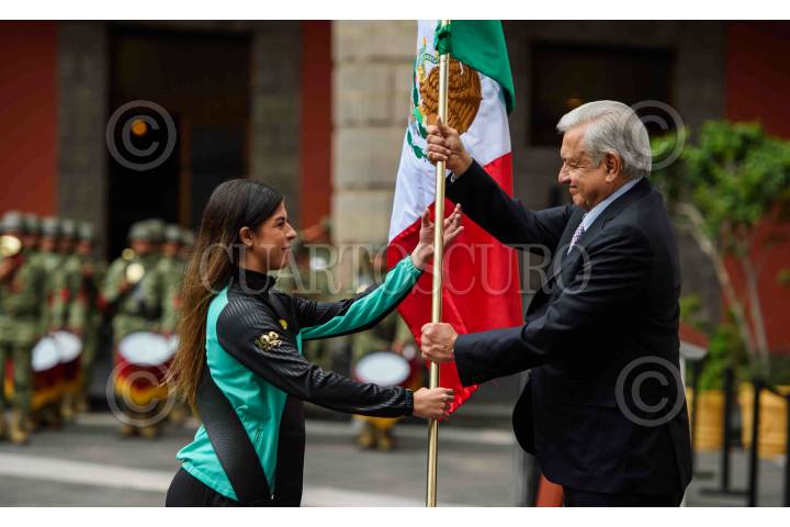 CIUDAD DE MÉXICO. 16OCTUBRE2023.- El presidente de los Estados Unidos Mexicanos, Andrés Manuel López Obrador preside Abanderamiento de la Delegación Mexicana, XIX Juegos Panamericanos Santiago 2023, en Palacio Nacional. Lo acompañan: Leticia Ramírez Amaya, secretaria de Educación Pública; Martí Batres Guadarrama, jefe de Gobierno de la Ciudad de México; Ana Gabriela Guevara Espinoza, Directora General de la Comisión Nacional de Cultura Física y Deporte CONADE; y María José Alcalá, presidenta del Comité Olímpico Mexicano. FOTO: PRESIDENCIA/CUARTOSCURO.COM