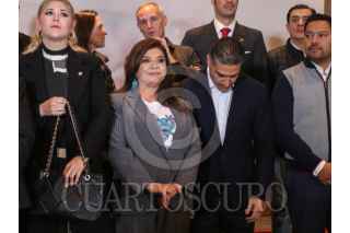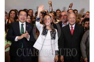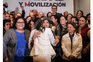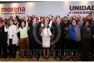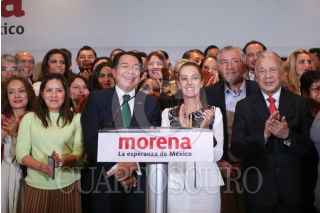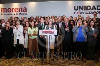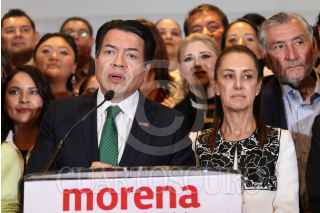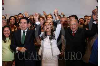 CIUDAD DE MÉXICO, 16OCTUBRE2023.- Mario Delgado y Claudia Sheinbaum, encabezaron conferencia de prensa con aspirantes a candidaturas de los estados por Morena, donde dieron detalles del proceso para elección de candidaturas. FOTO: ANDREA MURCIA /CUARTOSCURO.COM