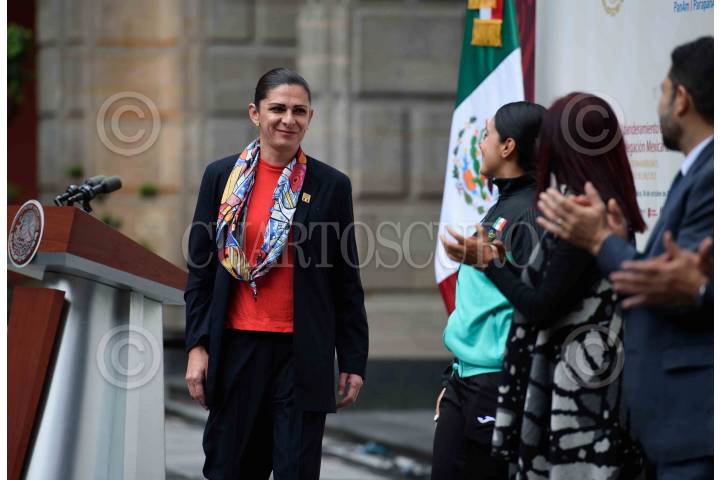 CIUDAD DE MÉXICO, 16OCTUBRE2023.- Ana Gabriela Guevara, directora de la CONADE, durante la ceremonia de abanderamiento de la delegación que participará en los Juegos Panamericanos de Santiago, en Palacio Nacional. FOTO: PRESIDENCIA/CUARTOSCURO.COM