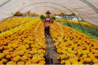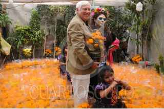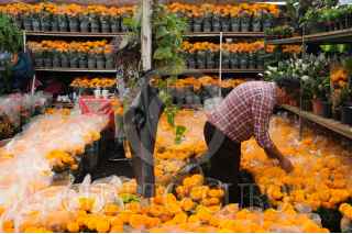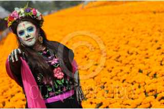 CIUDAD DE MÉXICO, 17OCTUBRE2023. - Una catrina posa dentro de una parcela de flores de Cempasúchil. FOTO: DANIEL AUGUSTO /CUARTOSCURO.COM