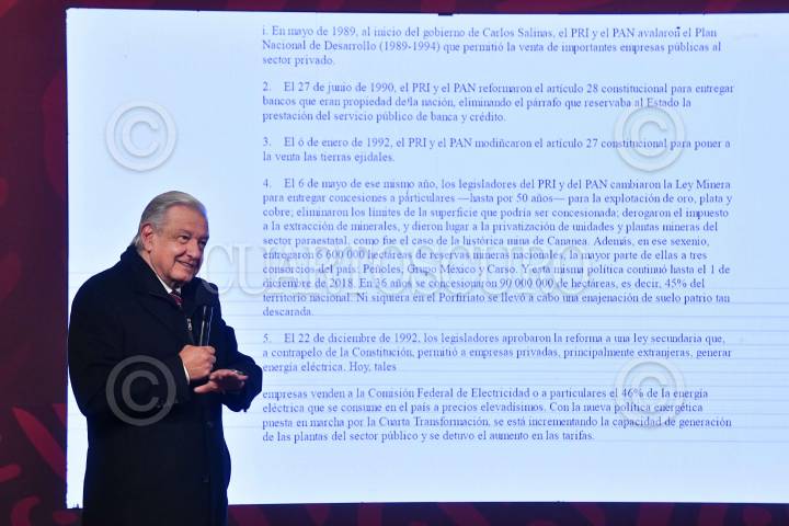 CIUDAD DE MÉXICO, 19OCTUBRE2023.- Andrés Manuel López Obrador, presidente de México, durante conferencia de prensa matutina indica las reformas constitucionales que el PAN y el PRI aprobaron durante la década de los noventa. FOTO: MARIO JASSO/CUARTOSCURO.COM