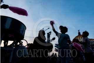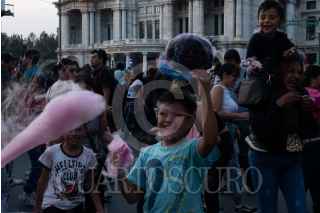 CIUDAD DE MÉXICO, 21OCTUBRE2023.- Niñas y niños disfrutan atrapando los hilos de algodón de azúcar que se escapan con el viento durante la preparación que los vendedores ambulantes hacen en el Centro Histórico durante la Marcha Zombie. FOTO: GALO CAÑAS/CUARTOSCURO.COM
