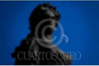 GUANAJUATO, GUANAJUATO, 21OCTUBRE2023.- La luna en su fase creciente se asoma entre la escultura de la Basílica Colegiata de Nuestra Señora de Guanajuato en la Plaza de la Paz. FOTO: GRACIELA LÓPEZ /CUARTOSCURO.COM