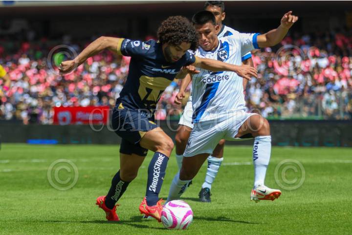 CIUDAD DE MÉXICO, 22OCTUBRE2023.- César "Chino" Huerta de Pumas desborda a jugadores de Monterrey, durante el encuentro disputado en el Estadio Olímpico Universitario. FOTO: MOISÉS PABLO/CUARTOSCURO.COM