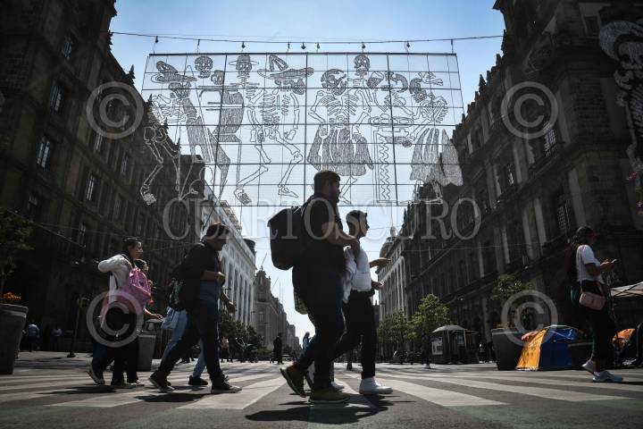 CIUDAD DE MÉXICO, 23OCTUBRE2023.- Transeúntes sobre la calle 20 de noviembre donde fueron colocados adornos con motivo del día de muertos. FOTO: MARIO JASSO/CUARTOSCURO.COM