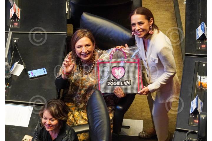 CIUDAD DE MÉXICO, 23OCTUBRE2023.-La senadora Josefina Vázquez Mota le regala una bolsa con la leyenda "Xóchitl Va" a la virtual candidata de la Presidencia por el Frente Amplio por México, Xóchitl Gálvez. FOTO: CUARTOSCURO.COM
