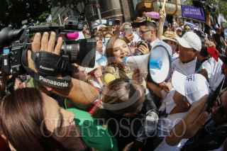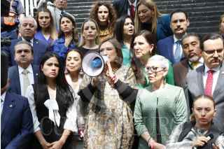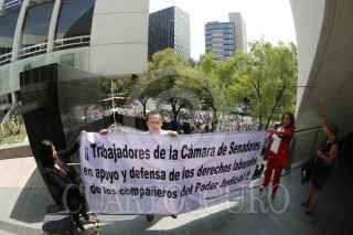 CIUDAD DE MÉXICO, 24OCTUBRE2023.- Con megáfono em mano Xóchilt Gálvez salió a apoyar la manifestación de los trabajadores del Poder Judicial de la Federación quienes protestaron por la intentona de desaparición de los fideicomisos de este órgano judicial afuera del Senado. FOTO: CUARTOSCURO.COM