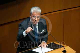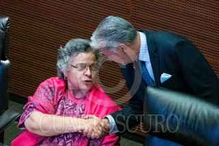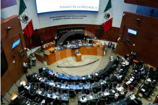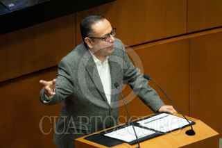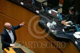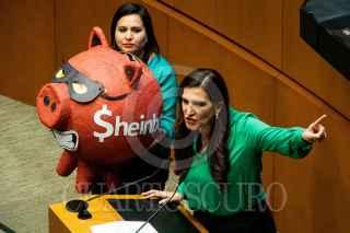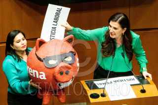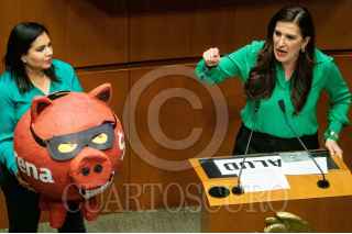 CIUDAD DE MÉXICO, 24OCTUBRE2023.- La senadora panista Kenya López Rabadán muestra un "cochinito" para Sheinbaum durante la sesión ordinaria en la Cámara de Senadores durante la discusión para la extinción de lo fideicomisos pertenecientes al Poder Judicial de la Federación. FORO: GALO CAÑAS/CUARTOSCURO.COM