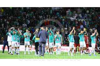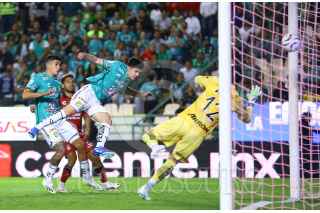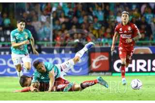 LEÓN, GUANAJUATO, 24OCTUBRE2023.- Ángel Mena de León cae sobre un jugador del Atlas, durante el encuentro que empataron a un gol. Partido correspondiente a la jornada 11 de la Liga MX. FOTO: JORGE ORTEGA/CUARTOSCURO.COM