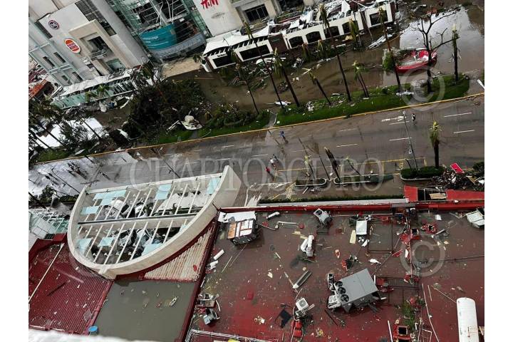 ACAPULCO, GUERRERO, 25OCTUBRE2023.- Plazas, hoteles y calles lucen destruidas tras la entrada del huracán Otis al puerto de Acapulco. Hasta el momento, se reporta una caída de las telecomunicaciones, así como bloqueos en las carreteras por diversos deslaves en la zona. FOTO: ESPECIAL/CUARTOSCURO.COM