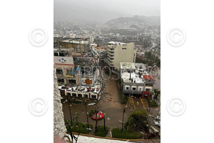 ACAPULCO, GUERRERO, 25OCTUBRE2023.- Plazas, hoteles y calles lucen destruidas tras la entrada del huracán Otis al puerto de Acapulco. Hasta el momento, se reporta una caída de las telecomunicaciones, así como bloqueos en las carreteras por diversos deslaves en la zona. FOTO: ESPECIAL/CUARTOSCURO.COM