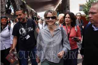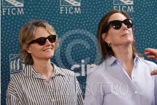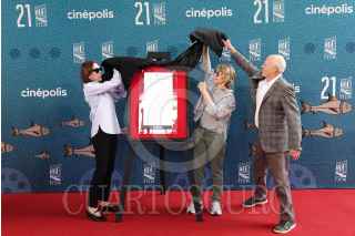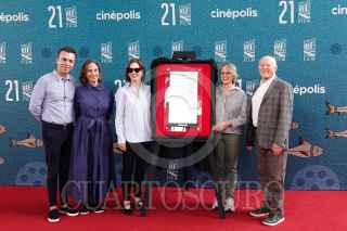 MORELIA, MICHOACÁN, 27OCTUBRE2023.- Ricardo Flores Magaña, director de Cinépolis; Daniela Michel, fundadora y directora del Festival Internacional de Cine en Morelia, y Jodie Foster, Kathleen Kennedy y Frank Marshall, directores de cine, durante la develación de la placa de la 21 edición del FICM en Cinépolis Morelia Centro. FOTO: GRACIELA LÓPEZ /CUARTOSCURO.COM