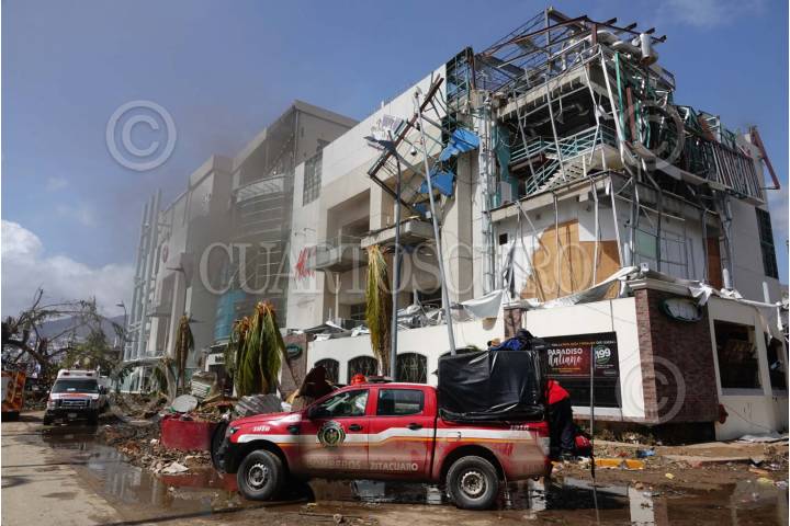 ACAPULCO, GUERRERO, 27OCTUBRE2023.- Elementos del cuerpo de Bomberos atienden un conato de incendio en las inmediaciones de un centro comercial afectado por el Huracán Otis. FOTO: ROGELIO MORALES/CUARTOSCURO.COM