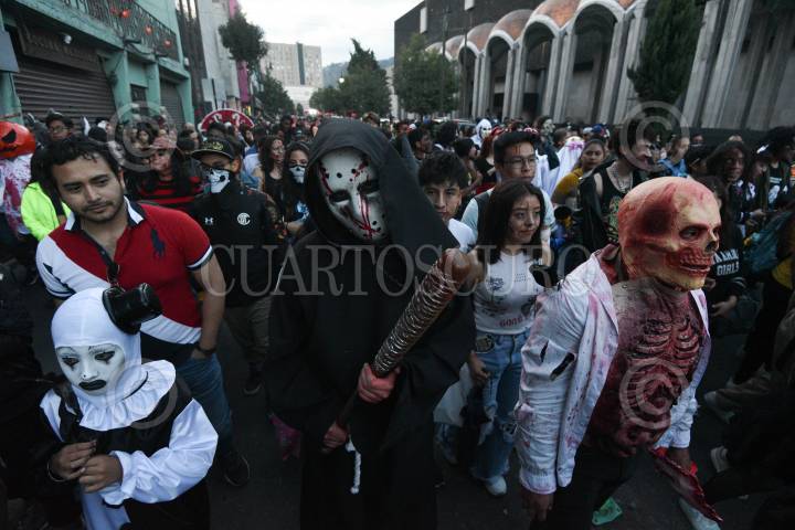 TOLUCA, ESTADO DE MÉXICO, 28OCTUBRE2023.- Zombies y monstruos tomaron las calles de Toluca este sábado por la tarde como parte de la Marcha Zombie que se realiza año con año en la capital mexiquense, los participantes fueron de todas las edades y en sus disfraces volcaron su gran ingenio. FOTO: CRISANTA ESPINOSA AGUILAR /CUARTOSCURO.COM