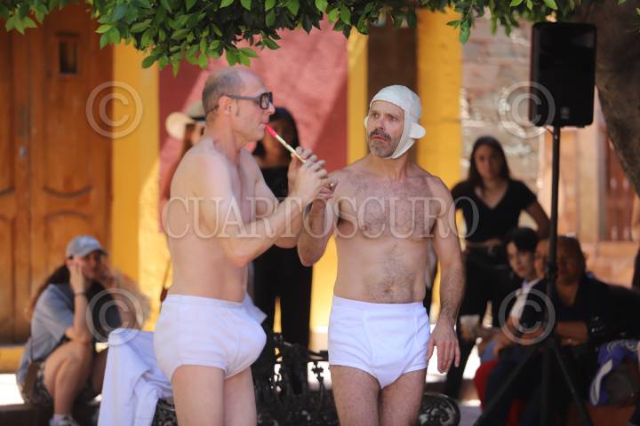GUANAJUATO, GUANAJUATO, 29OCTUBRE2023.- Espectáculo de clown de la compañía Oki Dok titulado “Una experiencia en calzoncillos”, en la Plaza Mexiamora durante la edición 51 del Festival Internacional Cervantino. FOTO: EDGAR NEGRETE LIRA/CUARTOSCURO.COM