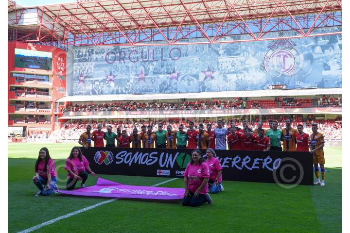 TOLUCA, ESTADO DE MÉXICO, 29 DE OCTUBRE 2023.- Con la frase “Somos uno Guerrero” los jugadores de los Diablos de Toluca y Atlético de San Luis se unieron en favor de las personas damnificadas por el huracán Otis en Guerrero previo al partido de la jornada 14 del Torneo Apertura de la Liga MX en el estadio Nemesio Diez. FOTO: CRISANTA ESPINOSA AGUILAR/ CUARTOSCURO.COM